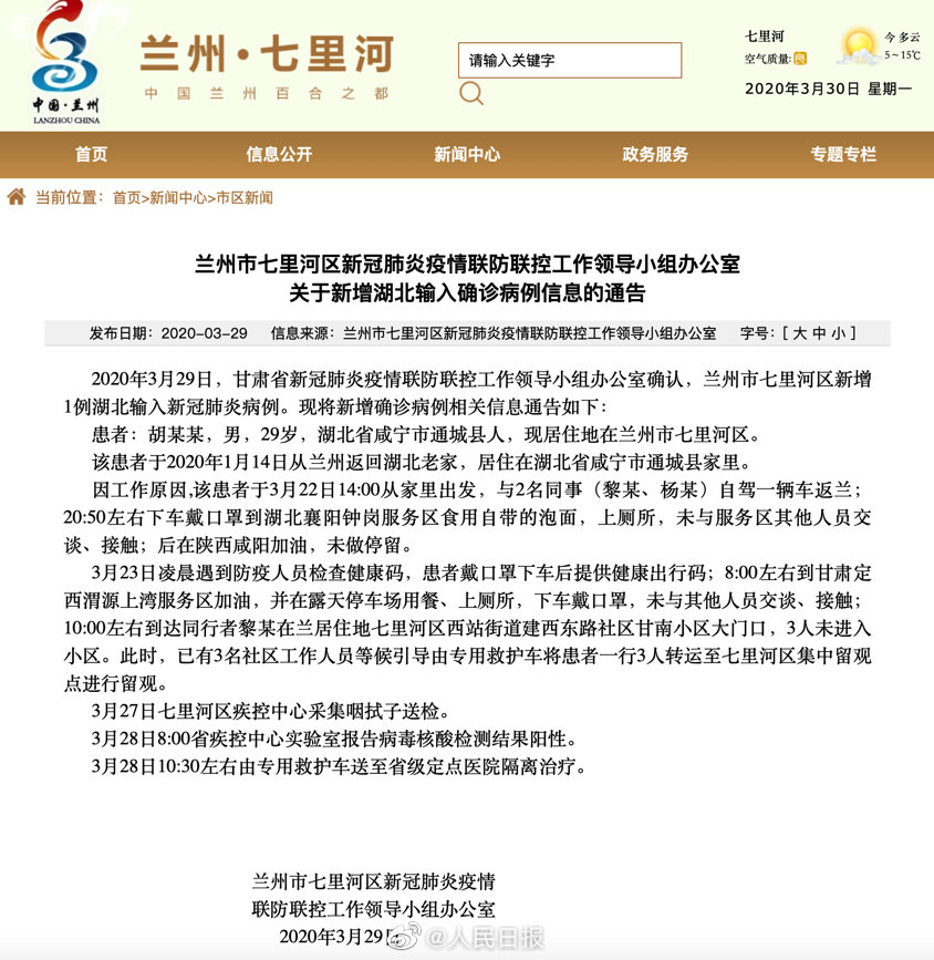 3月29日,甘肃省兰州市七里河区新增1例湖北输入新冠肺炎病例。现将新增确诊病例相关信息通告如下: