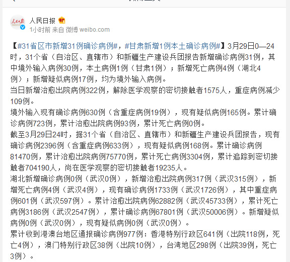 3月29日0—24时,31个省(自治区、直辖市)和新疆生产建设兵团报告新增确诊病例31例,其中境外输入病例30例,本土病例1例(甘肃1例);新增死亡病例4例(湖北4例);新增疑似病例17例,均为境外输入病例。