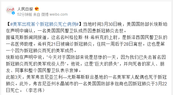 当地时间3月30日晚,美国国防部长埃斯珀在声明中确认,一名美国国民警卫队成员因患新冠肺炎去世。