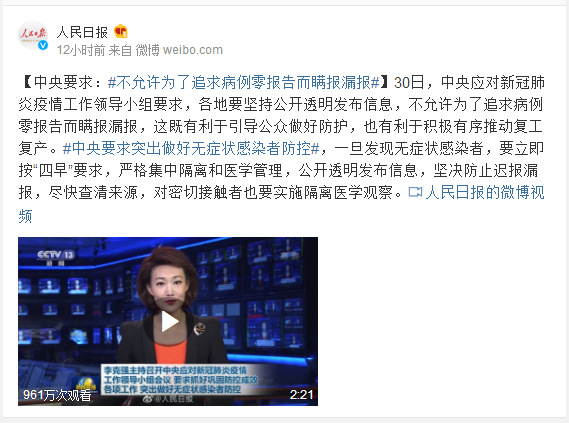 30日,中央应对新冠肺炎疫情工作领导小组要求,各地要坚持公开透明发布信息,不允许为了追求病例零报告而瞒报漏报,这既有利于引导公众做好防护,也有利于积极有序推动复工复产。#中央要求突出做好无症状感染者防控#,一旦发现无症状感染者,要立即按“四早”要求,严格集中隔离和医学管理,公开透明发布信息,坚决防止迟报漏报,尽快查清来源,对密切接触者也要实施隔离医学观察。