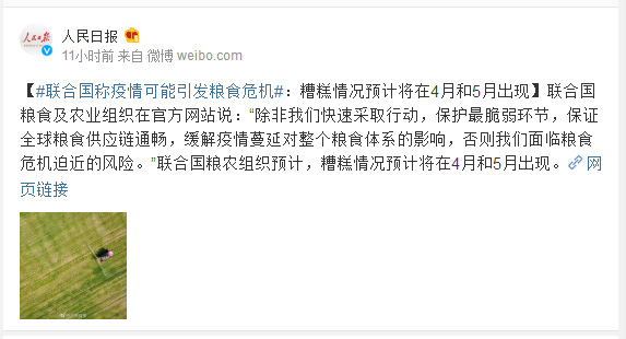 联合国粮食及农业组织在官方网站说:“除非我们快速采取行动,保护最脆弱环节,保证全球粮食供应链通畅,缓解疫情蔓延对整个粮食体系的影响,否则我们面临粮食危机迫近的风险。”联合国粮农组织预计,糟糕情况预计将在4月和5月出现。