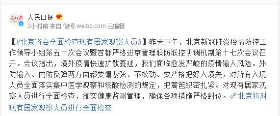昨天下午,北京新冠肺炎疫情防控工作领导小组第五十次会议暨首都严格进京管理联防联控协调机制第十七次会议召开。会议指出,境外疫情快速扩散蔓延,我们面临愈发严峻的疫情输入风险。外防输入、内防反弹两方面都要绷紧弦、不松劲。要严格把好入境关,对所有入境人员全面落实集中医学观察和核酸检测的规定,把篱笆织密扎紧。对现有居家观察人员进行全面检查,落实健康监测管理,确保各项措施严格到位。