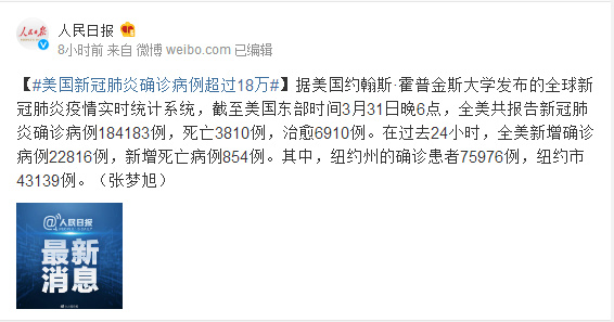 据美国约翰斯·霍普金斯大学发布的全球新冠肺炎疫情实时统计系统,截至美国东部时间3月31日晚6点,全美共报告新冠肺炎确诊病例184183例,死亡3810例,治愈6910例。在过去24小时,全美新增确诊病例22816例,新增死亡病例854例。其中,纽约州的确诊患者75976例,纽约市43139例。(张梦旭)