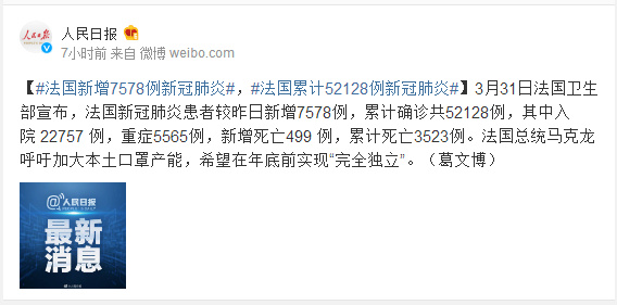 3月31日法国卫生部宣布,法国新冠肺炎患者较昨日新增7578例,累计确诊共52128例,其中入院 22757 例,重症5565例,新增死亡499 例,累计死亡3523例。法国总统马克龙呼吁加大本土口罩产能,希望在年底前实现“完全独立”。(葛文博)