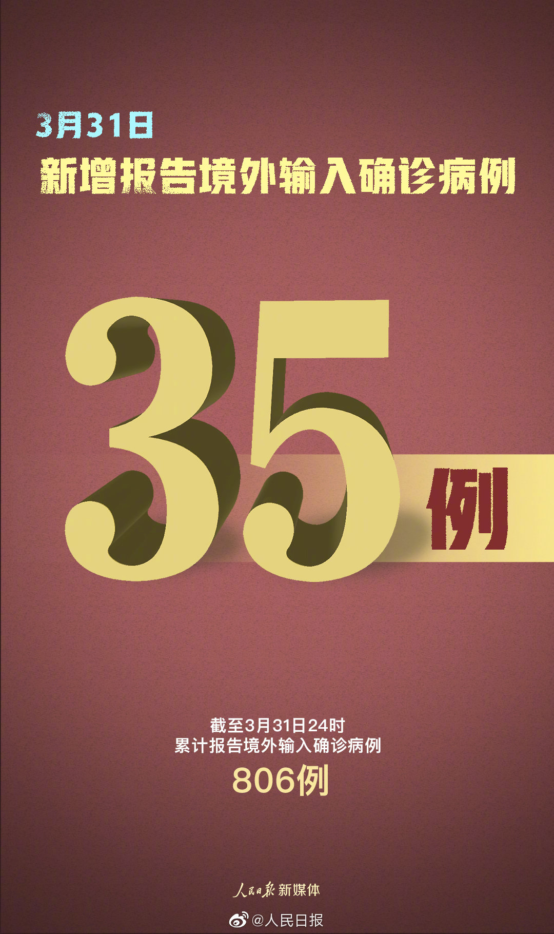 3月31日0—24时,31个省(自治区、直辖市)和新疆生产建设兵团报告新增确诊病例36例,其中境外输入病例35例,本土病例1例(广东1例);新增死亡病例7例(湖北6例,上海1例);新增疑似病例26例,均为境外输入病例。境外输入现有确诊病例691例(含重症病例20例),现有疑似病例169例。累计确诊病例806例,累计治愈出院病例115例,累计死亡病例0例。