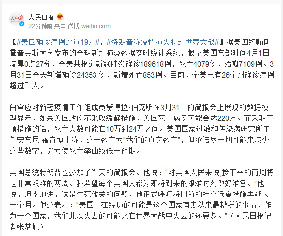 美国总统特朗普也参加了当天的简报会。他说:“对美国人民来说,接下来的两周将是非常艰难的两周。我希望每个美国人都为即将到来的艰难时刻做好准备。”他说,坦率地讲,这是生死攸关的问题,他正式呼吁将目前的社交远离措施再延长一个月。他还表示:“美国正在经历的可能是这个国家有史以来最糟糕的事情,作为一个国家,我们此次失去的可能比在世界大战中失去的还要多。”(人民日报记者张梦旭)