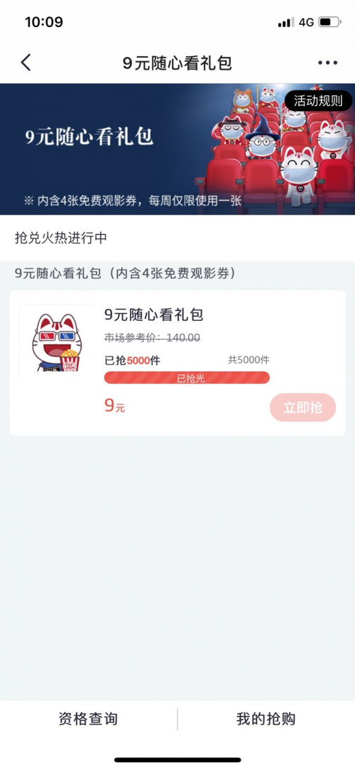 “9元随心看”是招行信用卡旗下掌上生活App推出的活动,限招行信用卡绑卡用户参与,活动期间每位用户限购买一次“随心看”礼包。礼包仅需9元就可获得4张免费观影券,7月24日至8月9日每日限量抢购。“9元随心看”活动一开始就受到影迷追捧,礼包销售十分火爆。