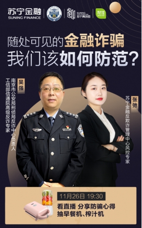 值得关注的是,在本次直播中,苏宁金融将抽送早餐机、榨汁机各一台。要想了解更多实用防骗技能,千万不要错过11月26日19:30的直播。
