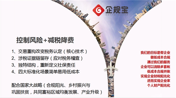 企规宝的目标是帮企业做低成本合规,通过企规宝的服务,企业可以消除多套帐,低成本合规并账。实现企业财税阳光化,进而实现企业家个人财产阳光化。企规宝有別于传统的税筹机构,使用企规宝的工具,控制风险的同时,也可以达成非常好的节税效果。相比较而言,有些税筹机构虽然帮你节税,但同时却可能带来巨大风险。表面上节省了一点税,结果很多时候,税没省到,反而带来各种罚款,有时候甚至直接教唆企业犯罪。因为做税筹给企业带来巨大损失的情况屡见不鲜,希望大家引以为鉴。把复杂的事情交给专业人士。专业团队的价值不仅仅在日常的财税服务,在企业风控管理上甚至能指导企业经营发展战略。