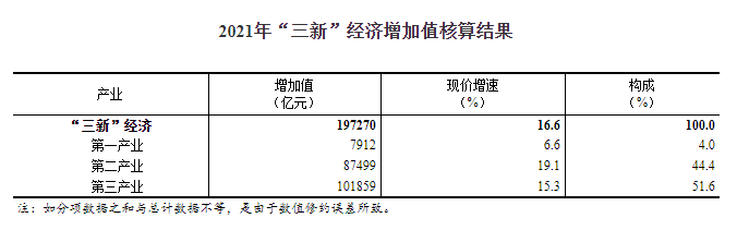 经核算,2021年我国“三新”经济增加值为197270亿元,比上年增长16.6%(未扣除价格因素,下同),比同期国内生产总值(GDP)现价增速高3.8个百分点;相当于GDP的比重为17.25%,比上年提高0.17个百分点。