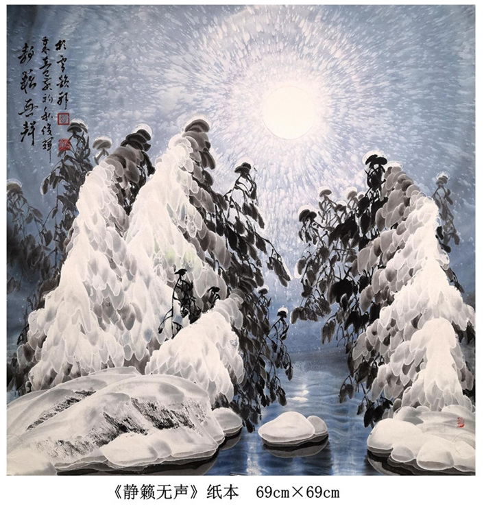 在谈到自己的作品时,赵俊辉介绍道,冰雪作品以北方冰雪为艺术创作背景,在继承中国传统绘画的基础上,融入了自己对北方冰雪的独特理解和热爱,以及新的艺术表现方法。努力展示出冰雪消融来滋润万物,恩泽寰宇,普惠人类,净化心灵这种无私奉献的高尚品格和玉洁冰清的“冷逸之美”,以求对大美兴安冰山雪海伟大品格和习总书记“绿水青山就是金山银山,冰天雪地也是金山银山”重要讲话精神最美的艺术诠释。